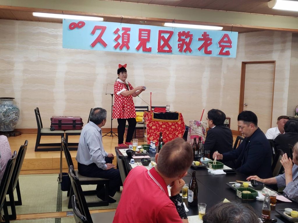 久須見にお住まいの78歳以上のお年寄り180名のうち53名の方が参加され盛大に開催されました。アトラクションでは大井町の小板美江子さんによるマジックや腹話術が披露され、後半では豪華景品の当たるくじ引きも行われ、皆さん一足早い敬老の日の一日を満喫されました。