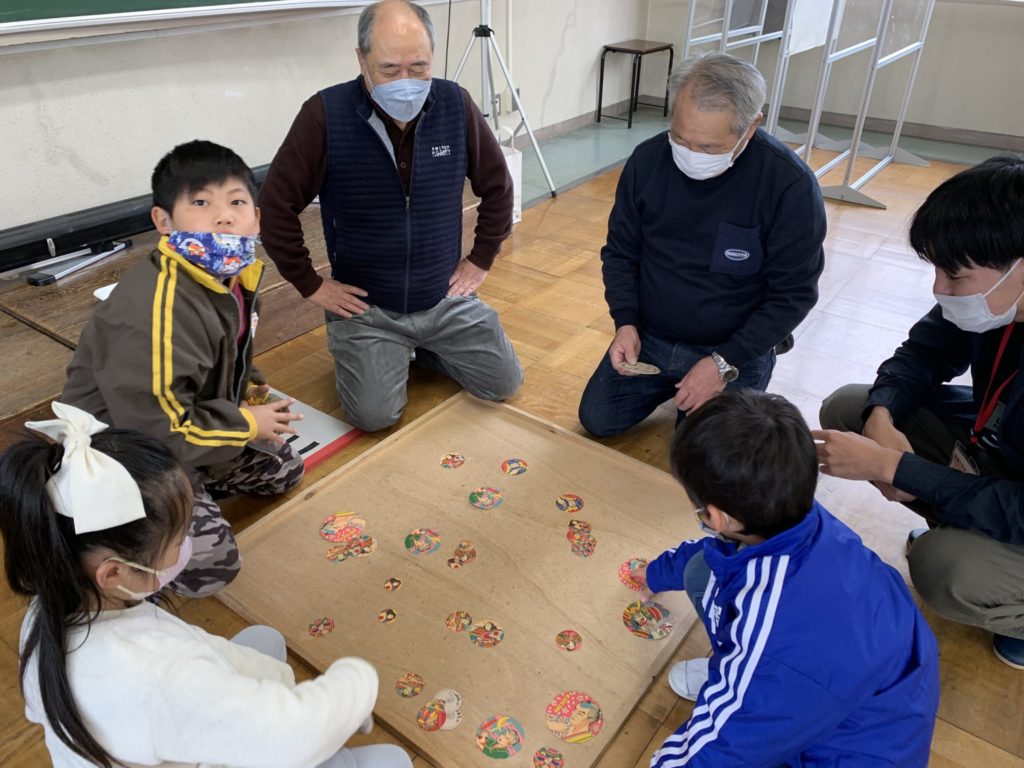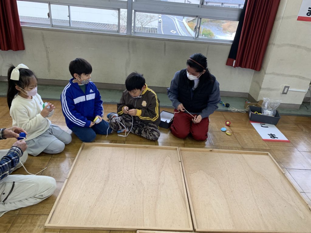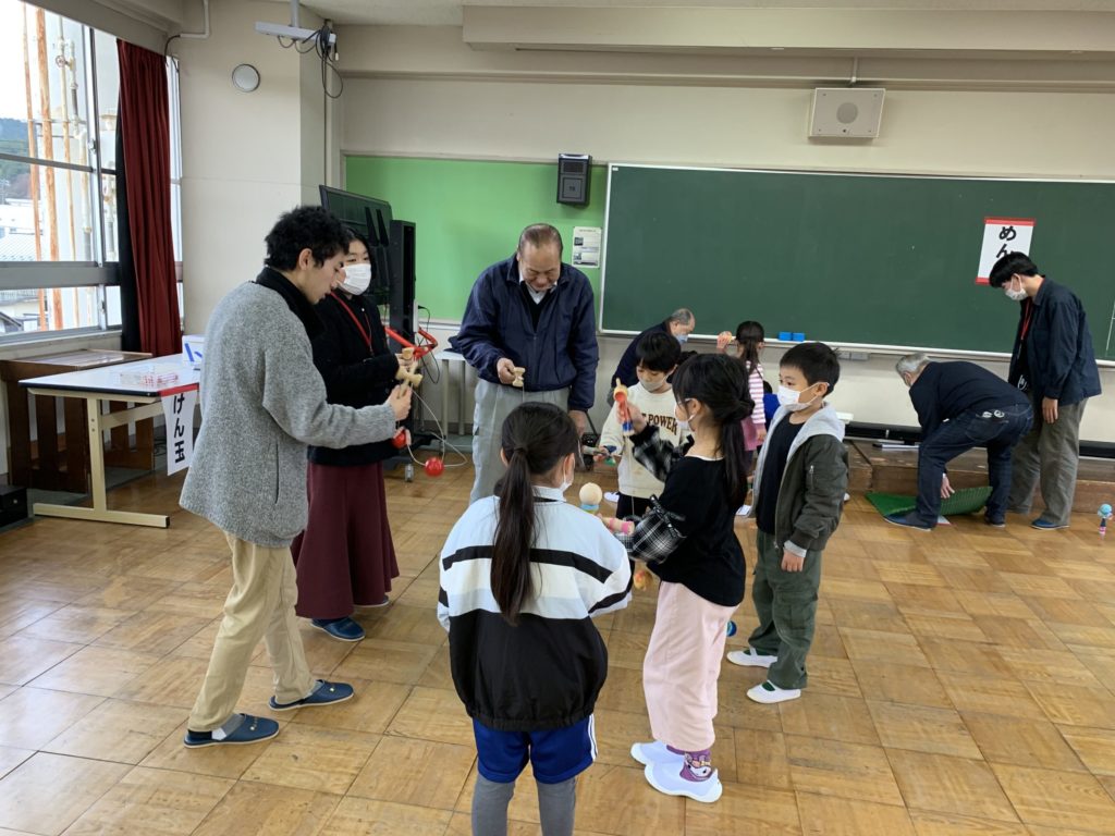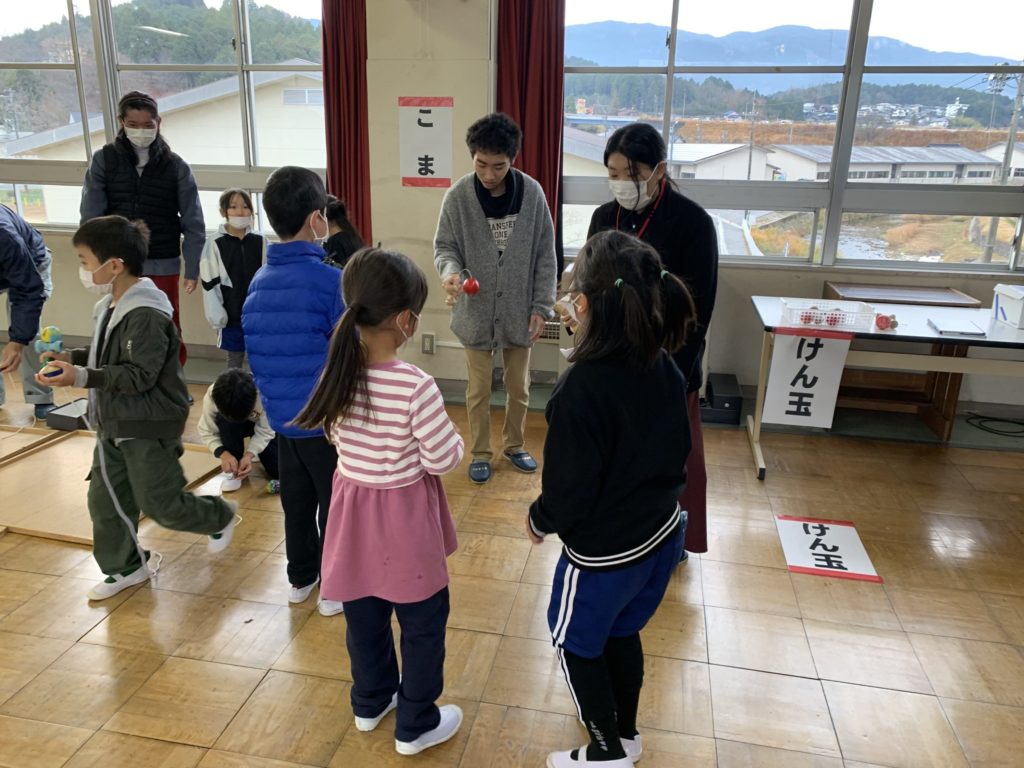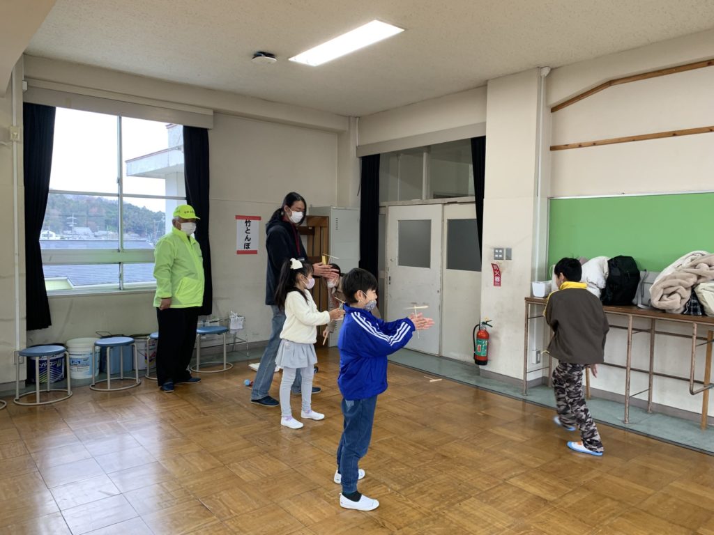 12月8日(月)長島小1年生が、昔遊びを体験しました。長島町壮健クラブ連合会のみなさん8名と中部大学伝統文化探究会の学生8名が、竹とんぼ・コマ・けん玉・メンコ・お手玉の5種類の昔遊びを教えてくださいました。子どもたちは各クラス5つのグループに分かれ、順番に各遊びを回りました。最後に教えていただいた皆さんに子どもたちより歌のプレゼントがあり、楽しい時間となりました。