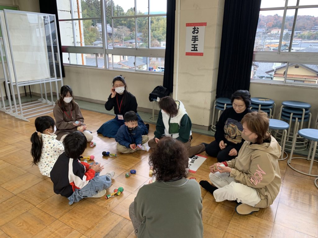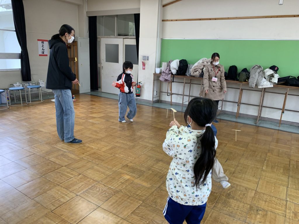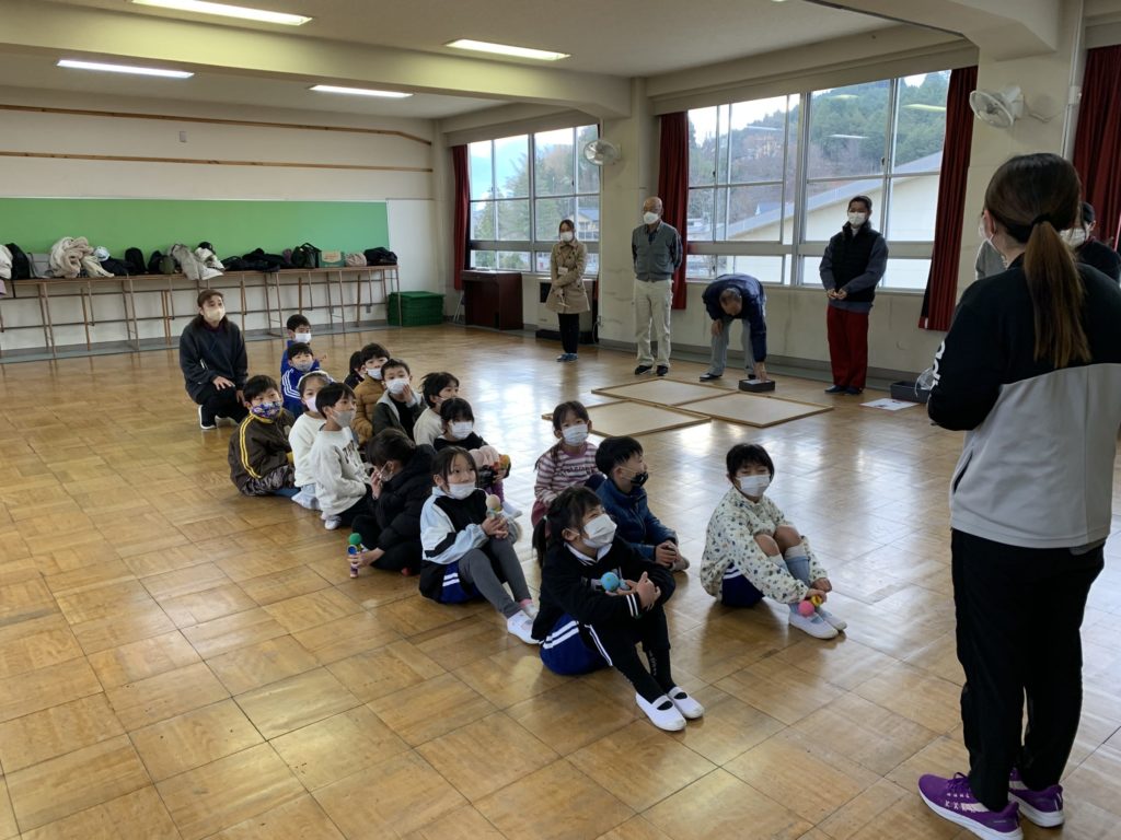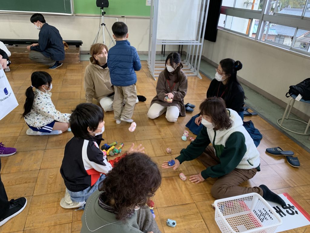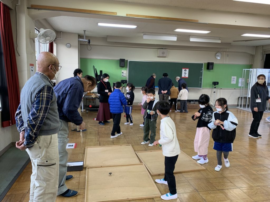 12月8日(月)長島小1年生が、昔遊びを体験しました。長島町壮健クラブ連合会のみなさん8名と中部大学伝統文化探究会の学生8名が、竹とんぼ・コマ・けん玉・メンコ・お手玉の5種類の昔遊びを教えてくださいました。子どもたちは各クラス5つのグループに分かれ、順番に各遊びを回りました。最後に教えていただいた皆さんに子どもたちより歌のプレゼントがあり、楽しい時間となりました。