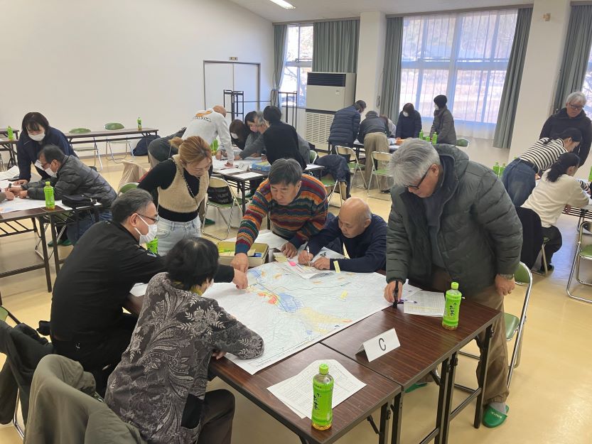 1月17日(土)、永田区にて「災害図上訓練(DIG)」が開催されました。当日は区の役員をはじめ、民生委員児童委員、自治会長、福祉委員、女性防災リーダー、恵那市社協長島支部など、地域の中心となる方々が44名参加しました。また、中野方支部の支部長と事務局の方のご参加もありました。